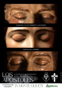 Acto especial enmarcado dentro del 75 aniversario de la Cofradía de la Oración en el Huerto en el que se realiza la presentación y bendición de las tallas de San Pedro, Santiago y San Juan, que se incorporan al paso titular de la misma y que supone un importante enriquecimiento del patrimonio vinculado a la celebración de la Semana Santa Soriana.